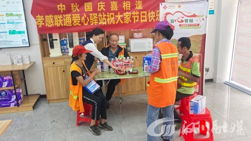 为向环卫工人、外卖骑手、快递员等户外劳动者致以节日的问候与关怀,汉川仙女路联通营业厅精心打造“爱心驿站”,为户外劳动者送上矿泉水、月饼等物资,用实际行动传递联通温度。