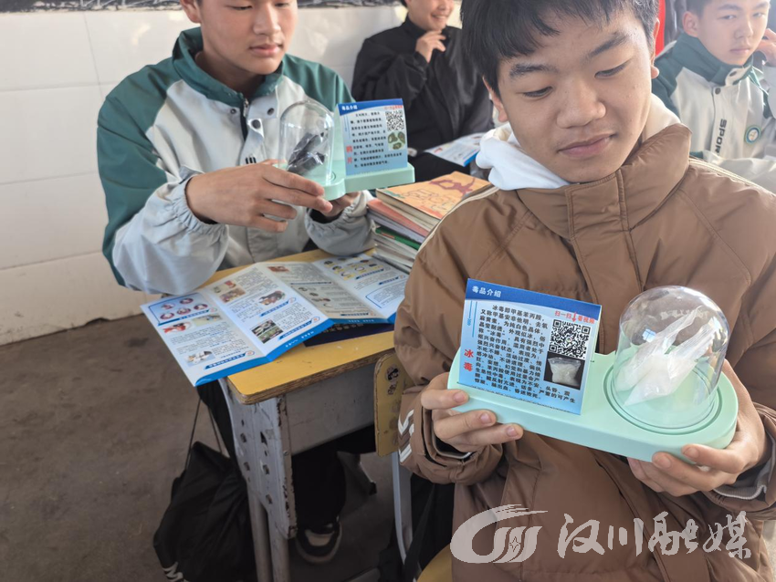 在仿真毒品模型展示环节,禁毒社工详细介绍了毒品的常见种类、伪装形式及防范技巧,不时和学生互动交流,帮助同学们“零距离”认清毒品原貌,同学们对笑气、跳跳糖、奶茶等伪装毒品有了更直观认识,学会了辨别与远离陷阱。