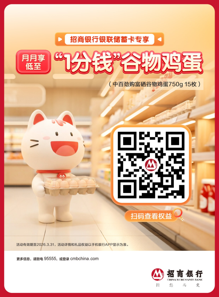 不管是日常家庭使用,还是给长辈备货,15个鸡蛋都能满足一段时日的需求。招商银行始终致力于打造“招行卡好用”的用卡环境,为您带来切实的便捷与实惠。赶紧扫码领券,奔赴中百仓储,把新鲜鸡蛋带回家吧!