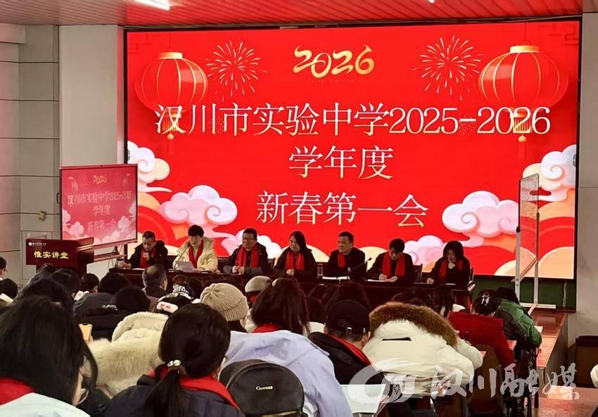 2月28日,汉川市实验中学举行2026年新学期团拜会,全体教职工齐聚一堂,共启新征程。每位教师获赠红围巾,现场暖意融融。