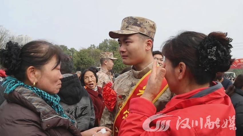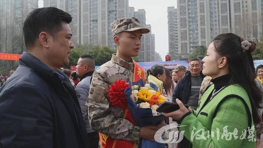 新兵代表涂梓衡:“我叫涂梓衡,来自汉川市沉湖镇,是一名二次入伍的老兵,今天又作为新兵参加欢送大会,心情感到非常激动。我一定不会忘记家乡父老的嘱托,在军营建功立业。”