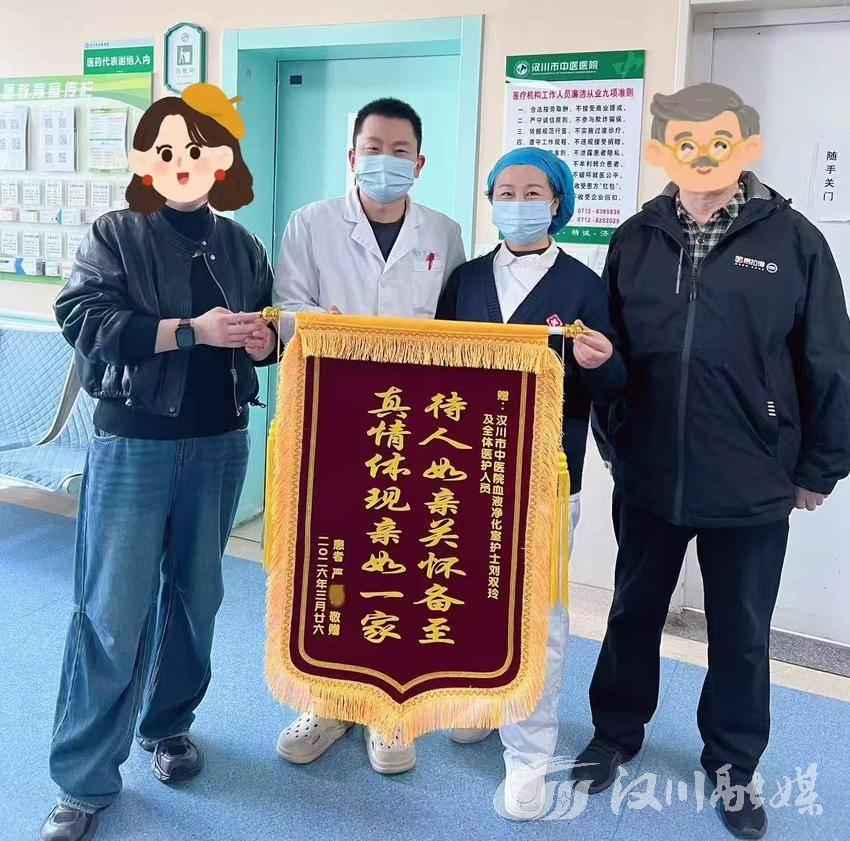 “这么多年了,这里的医生护士就像家人一样。”“感谢血液净化室的全体医护人员。”近日,汉川市中医医院血液净化室里,两名长期接受透析治疗的患者不约而同送来两面锦旗,用最朴素的方式表达对医护人员的谢意。