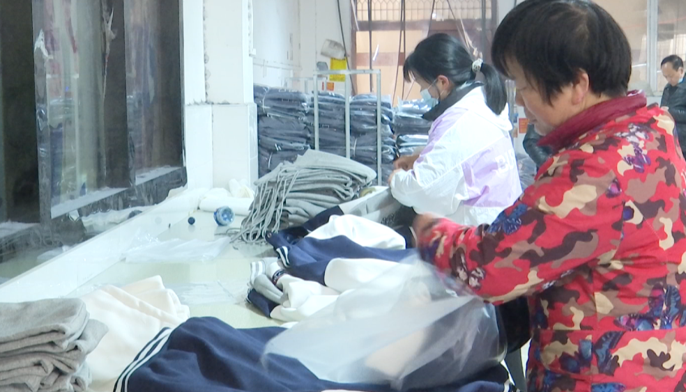 1月20日,在西江乡湖北欧派金果果服饰有限公司的生产车间,工作人员正在对成品衣物进行统一包装,在全部装订完毕后,物流公司会定时定点上门取货将商品销往全国。