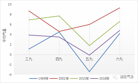 常言道“冷在三九”,意思是一年之中最冷的时节一般出现在三九,又说“三九四九冰上走,五九六九沿河看柳”。湖北省位于长江流域中下游,从多年平均值来看最冷的时段一般出现在1月中下旬,三九、四九、五九、六九我省平均气温分别为3.9℃、3.8℃、4.7℃和6.1℃,基本上符合五九、六九较三九、四九更暖的时间变化特征。