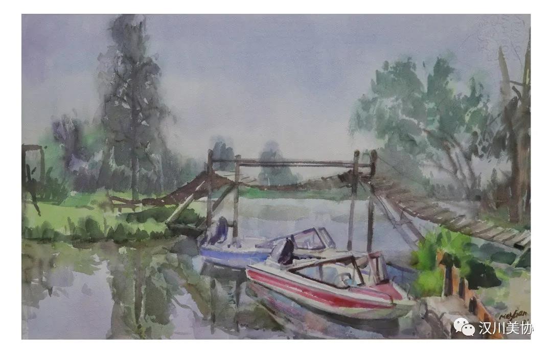 《汉川印象-汈汊湖的船》水彩画,38cm*54cm