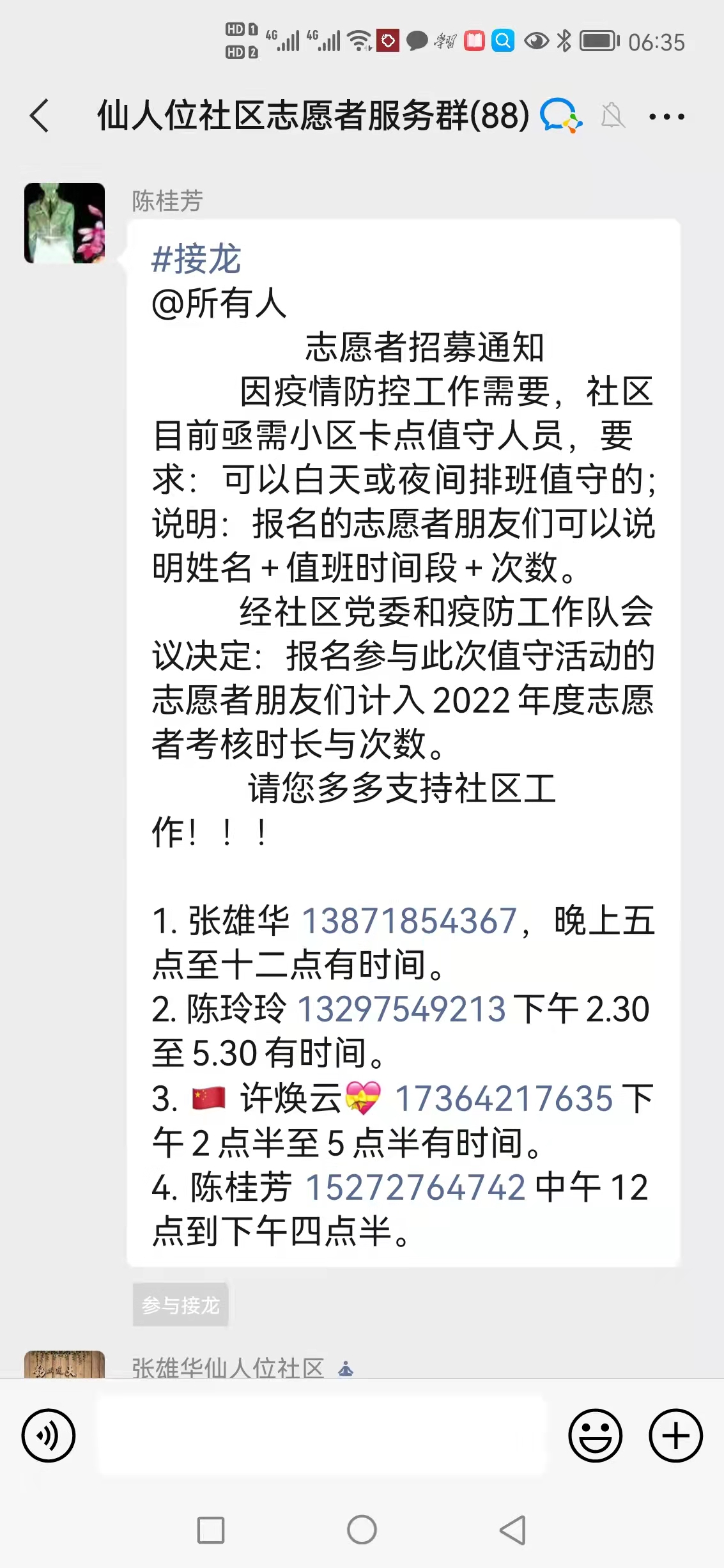 因疫情防控工作需要,社区目前亟需小区卡点值守人员。要求可白天或夜间排班值守。报名的志愿者朋友可注明姓名+值班时间段+次数。